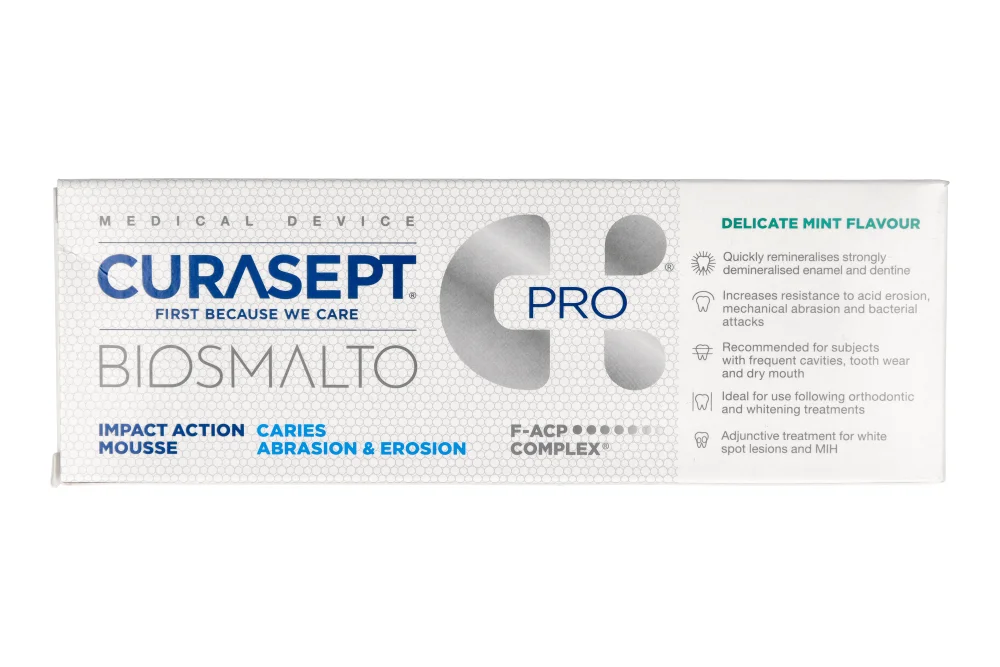 Opakowanie zawiera: Mus Biosmalto PRO 150 ml Curasept, w wybranym wariancie.