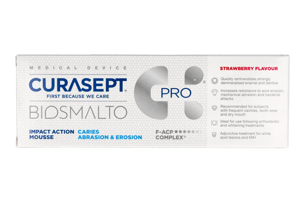 Curasept Biosmalto to specjalistyczna linia produktów do codziennej pielęgnacji jamy ustnej, stworzona z myślą o ochronie szkliwa, remineralizacji zębów oraz poprawie komfortu przy nadwrażliwości. Formuły Biosmalto wspierają naturalne procesy odbudowy twardych tkanek zęba, zwiększając ich odporność na działanie kwasów, próchnicę, ścieranie i erozję.