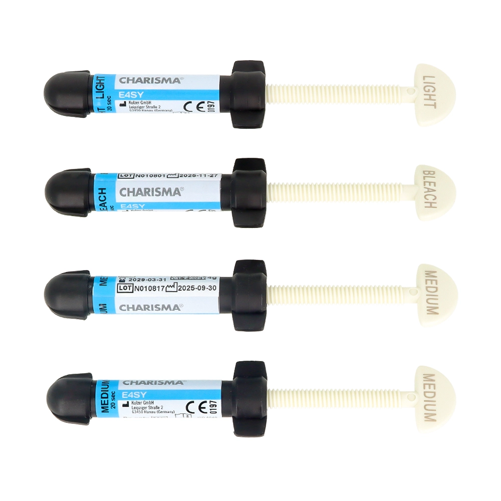 Charisma E4SY to nowoczesny materiał kompozytowy firmy Kulzer, zaprojektowany z myślą o maksymalnym uproszczeniu codziennej pracy stomatologa, przy jednoczesnym zachowaniu wysokiej estetyki i trwałości wypełnień. Dzięki innowacyjnemu podejściu do doboru koloru oraz zaawansowanej technologii materiałowej, produkt pozwala na szybkie i przewidywalne uzyskanie naturalnych efektów. System ten zastępuje tradycyjne, rozbudowane skale kolorystyczne (np. VITA), umożliwiając szybki i intuicyjny dobór odcienia bez konieczności skomplikowanej analizy. Odpowiednio dobrana przezierność materiału pozwala na uzyskanie naturalnego efektu estetycznego, nawet przy zastosowaniu jednego koloru.