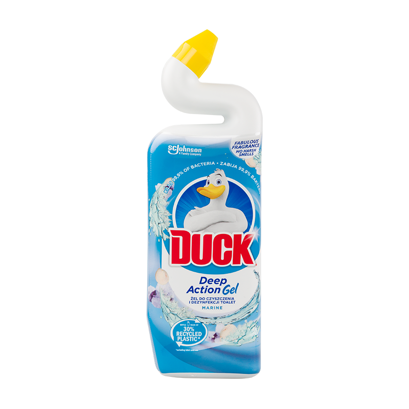 Profilowany aplikator w kształcie kaczki sprawia, że płyn dociera nawet w trudno dostępne miejsca, aby dokładnie wyczyścić i usunąć bakterie z każdego zakamarka (w tym z obrzeży). Konsystencja Ducka jest na tyle gęsta, że aplikowany płyn nie od razu spływa na dno i jest w stanie usunąć kamień i żółte przebarwienia na powierzchni muszli. Produkt posiada przyjemny morski zapach, który odświeża pomieszczenie po zastosowaniu.