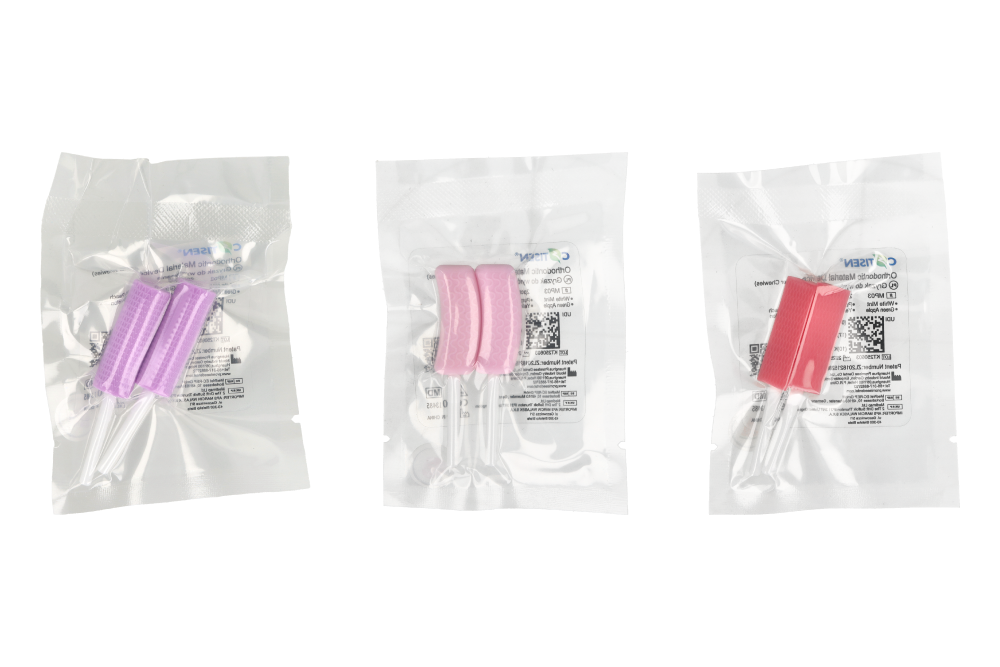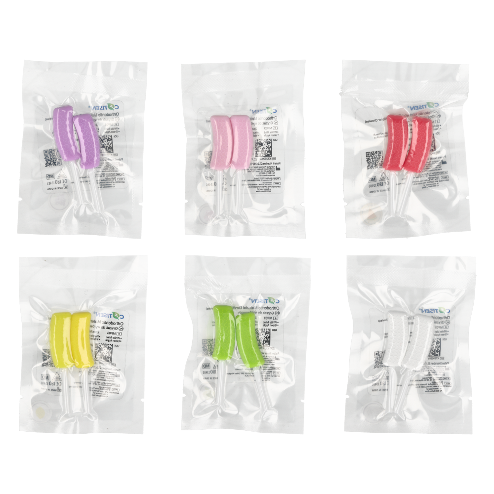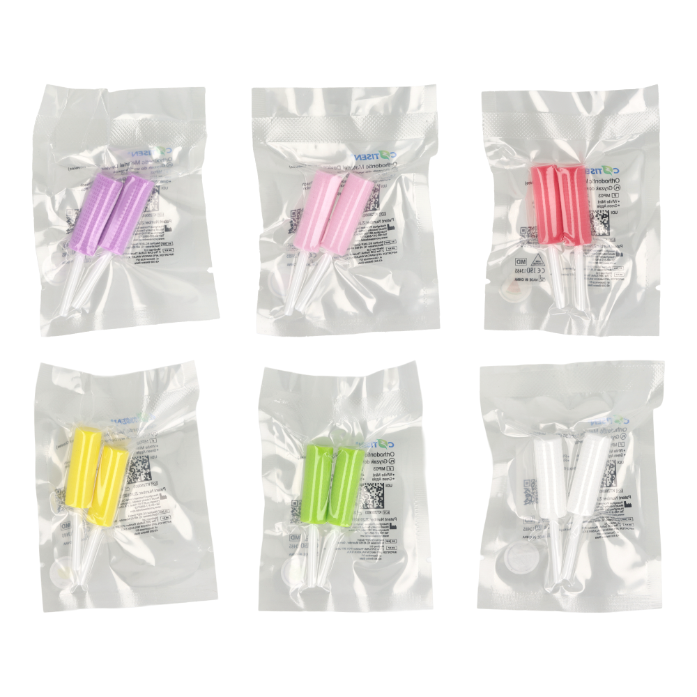Zestaw dwuch silikonowych wałeczków (chewies) zaprojektowanych do wspierania leczenia ortodontycznego przy użyciu nakładek/alignerów. Pomagają w prawidłowym osadzaniu nakładek na zębach, zapewniając ich dokładne przyleganie i skuteczniejsze działanie korekcyjne.