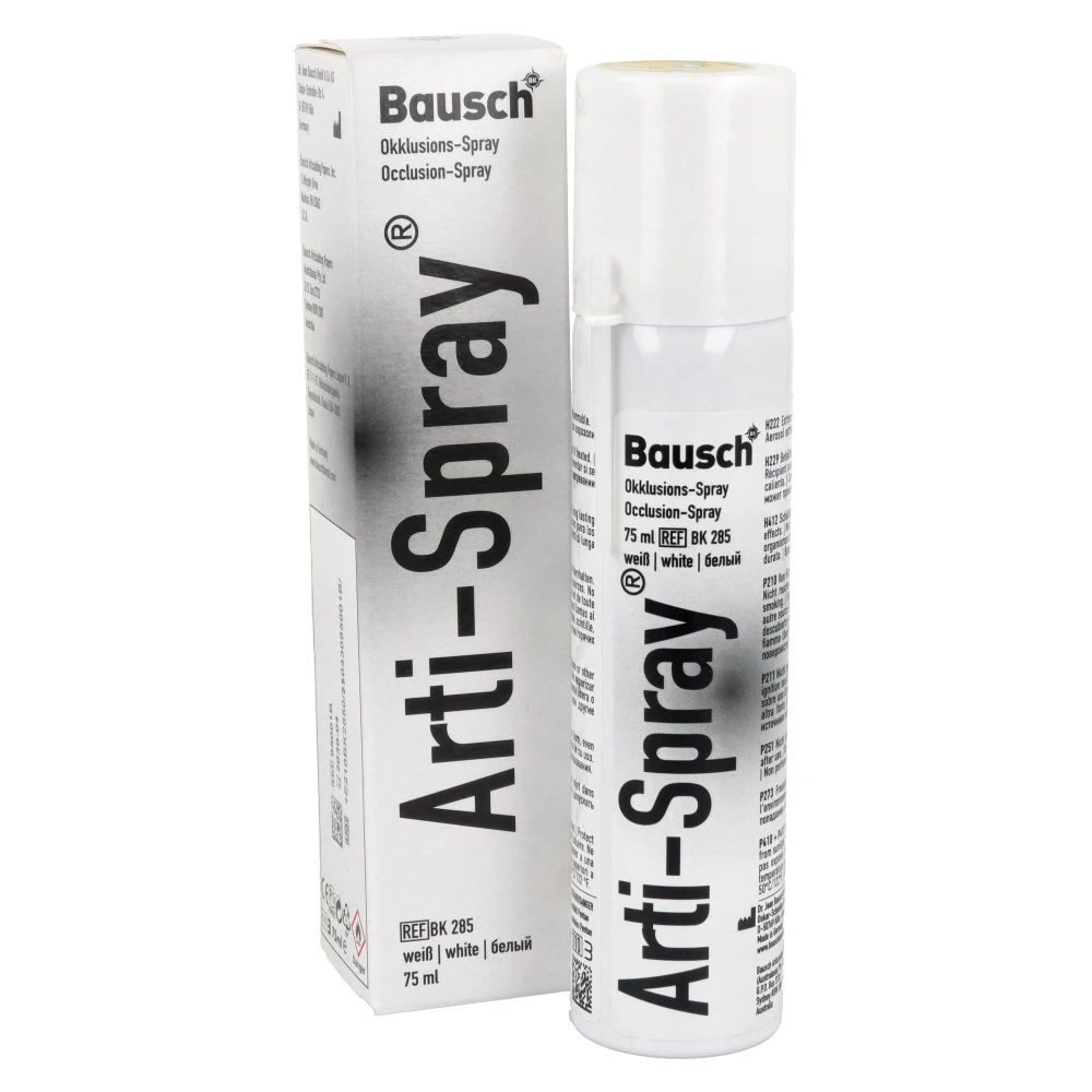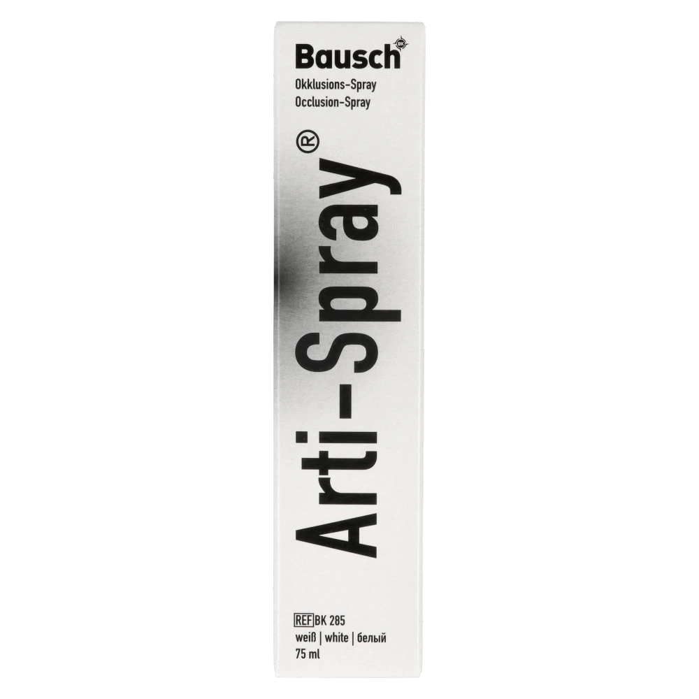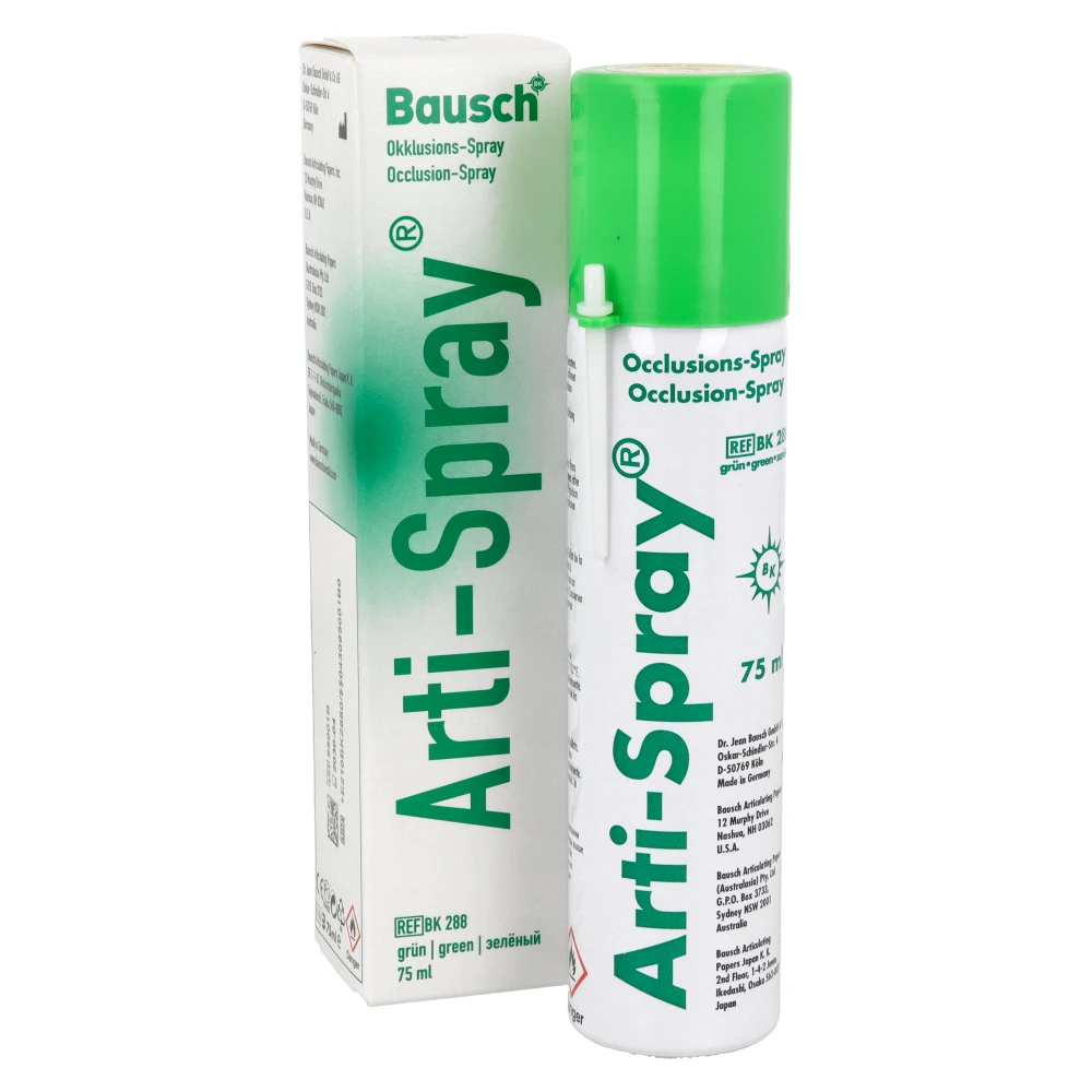 Bausch Arti-Spray to wysokiej jakości spray artykulacyjny przeznaczony do dokładnej kontroli kontaktów okluzyjnych oraz dopasowania prac protetycznych. Tworzy cienką, jednorodną warstwę barwną, która umożliwia natychmiastową identyfikację punktów kontaktowych poprzez jej selektywne ścieranie w miejscach nacisku. Produkt znajduje zastosowanie zarówno w praktyce klinicznej, jak i w laboratoriach protetycznych, stanowiąc niezastąpione narzędzie w nowoczesnej diagnostyce okluzji.