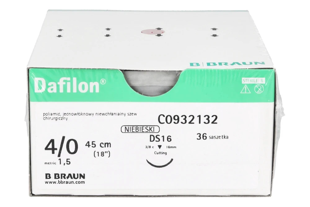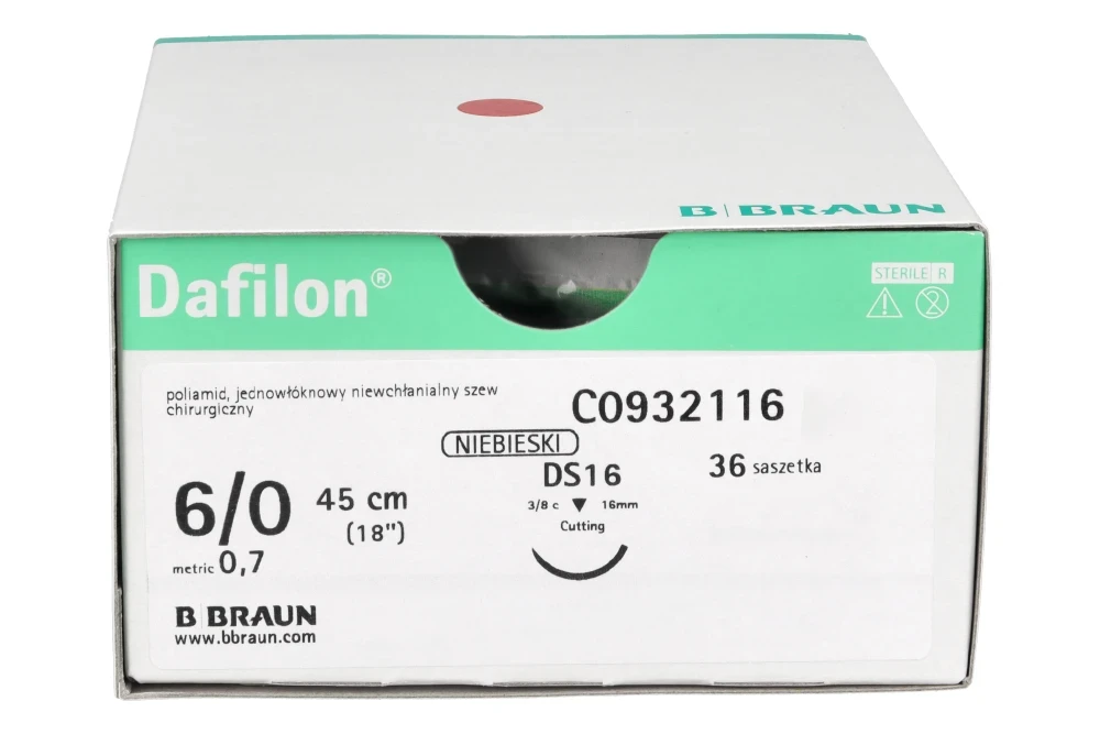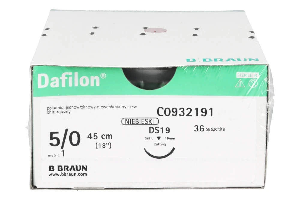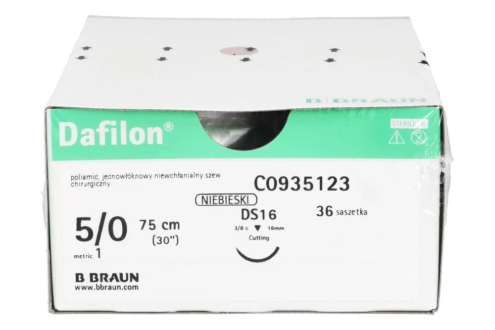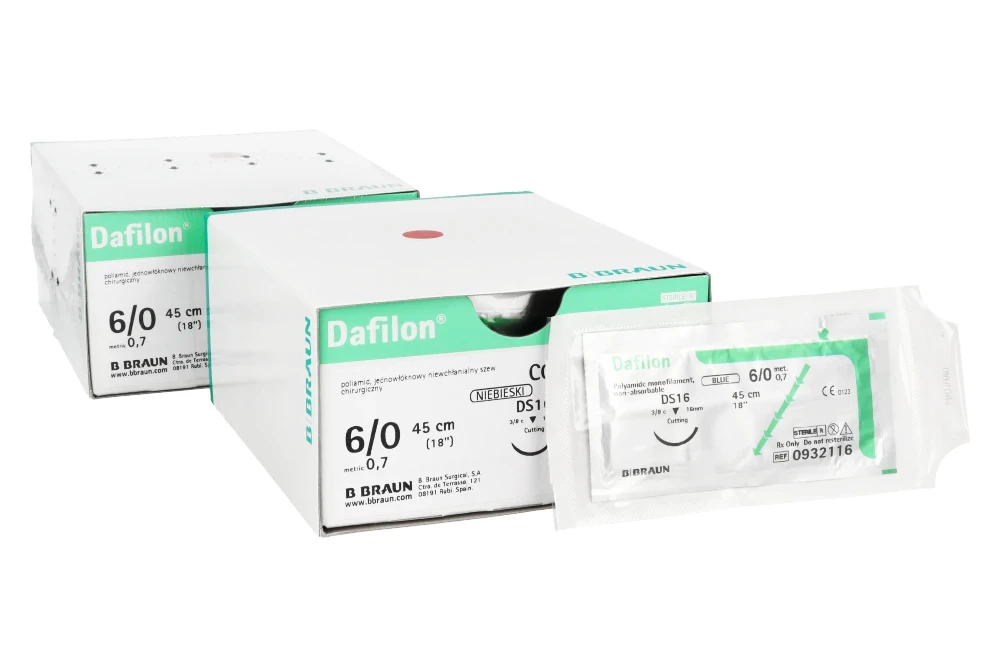 Dafilon® to niewchłanialny, monofilamentowy szew poliamidowy przeznaczony do precyzyjnego zamykania tkanek, szczególnie w miejscach wymagających trwałego podtrzymania oraz dobrej widoczności nici w polu operacyjnym. Intensywny niebieski kolor zapewnia wyraźny kontrast względem tkanek, co ułatwia kontrolę szwu podczas zabiegu oraz jego późniejsze usunięcie. Dzięki monofilamentowej strukturze Dafilon® minimalizuje ryzyko infekcji (brak kapilarności), ogranicza traumatyzację tkanek i zapewnia wysoką odporność na rozciąganie.