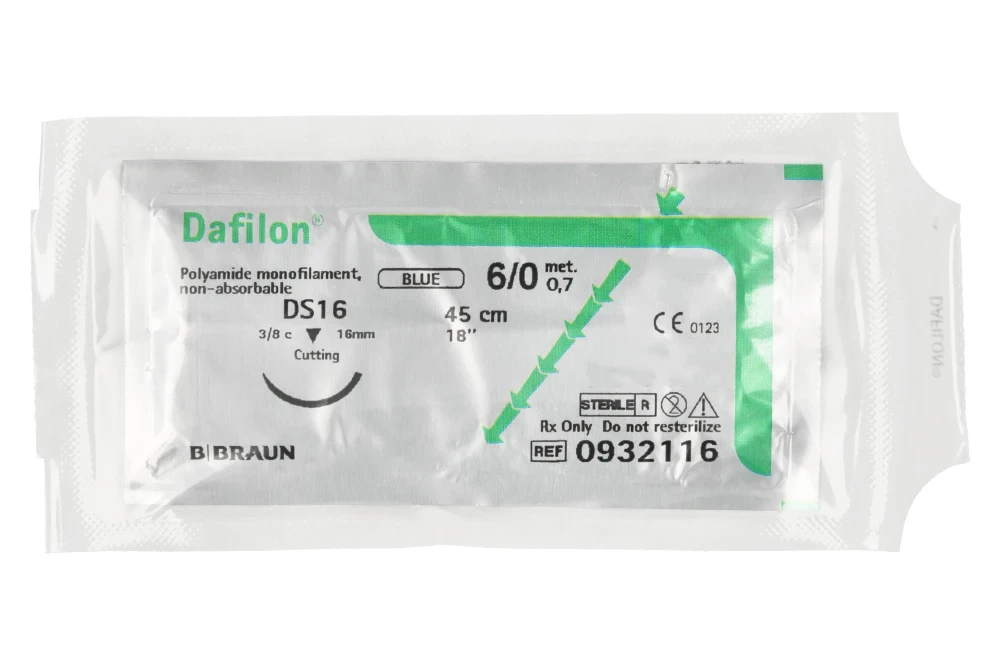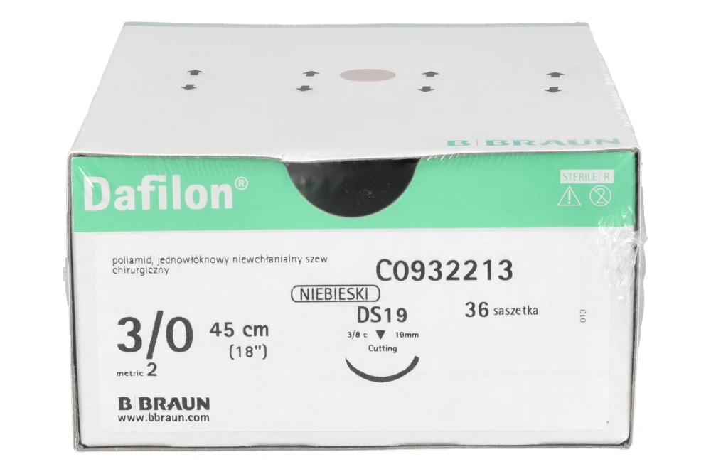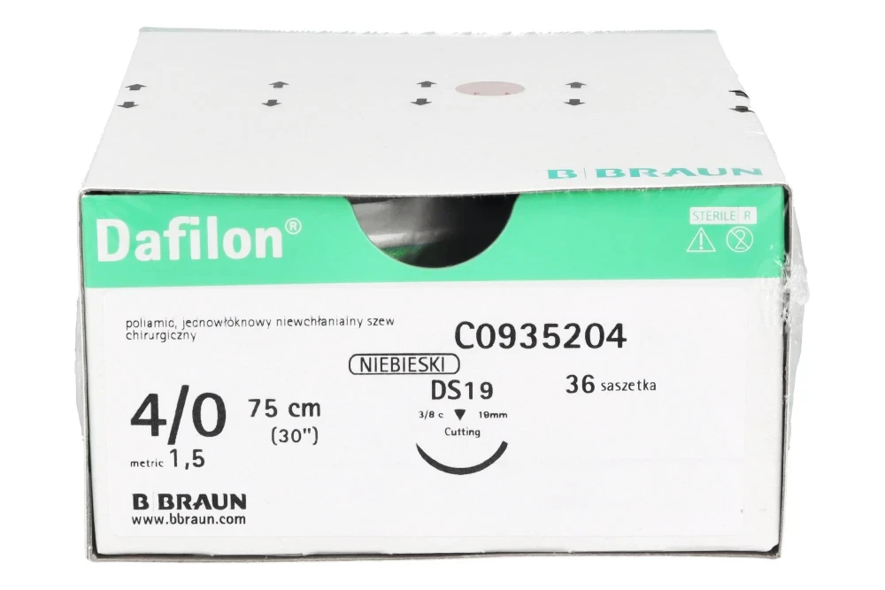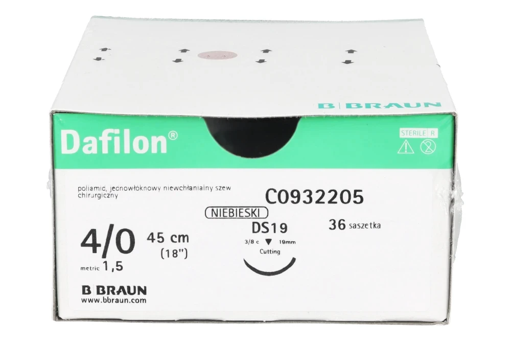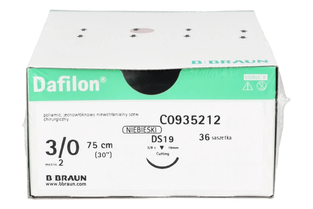 Dafilon® to niewchłanialny, monofilamentowy szew poliamidowy przeznaczony do precyzyjnego zamykania tkanek, szczególnie w miejscach wymagających trwałego podtrzymania oraz dobrej widoczności nici w polu operacyjnym. Intensywny niebieski kolor zapewnia wyraźny kontrast względem tkanek, co ułatwia kontrolę szwu podczas zabiegu oraz jego późniejsze usunięcie. Dzięki monofilamentowej strukturze Dafilon® minimalizuje ryzyko infekcji (brak kapilarności), ogranicza traumatyzację tkanek i zapewnia wysoką odporność na rozciąganie.