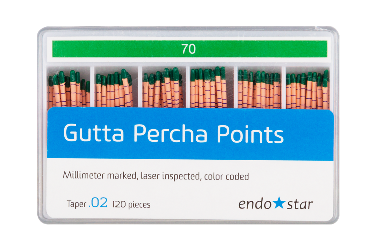 Gutaperka kalibrowana z oznaczeniem długości, zachowuje optymalną plastyczność oraz gładką powierzchnię, co pozwala na łatwe wprowadzanie jej do kanału. Eliminują możliwość powstawania perforacji wierzchołków. Ćwieki gutaperkowe w kanale korzeniowym wykazują stabilność kształtu, nie rozpuszczają się pod wpływem płynów tkankowych.