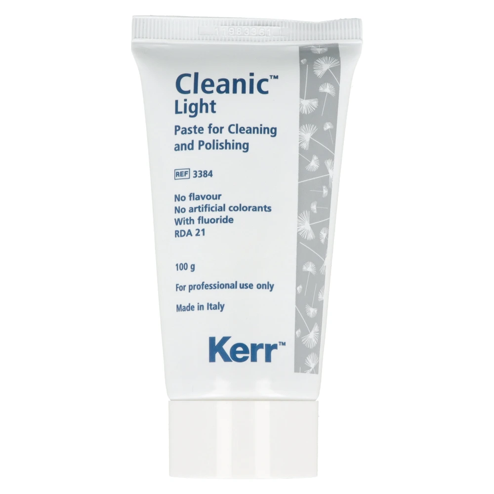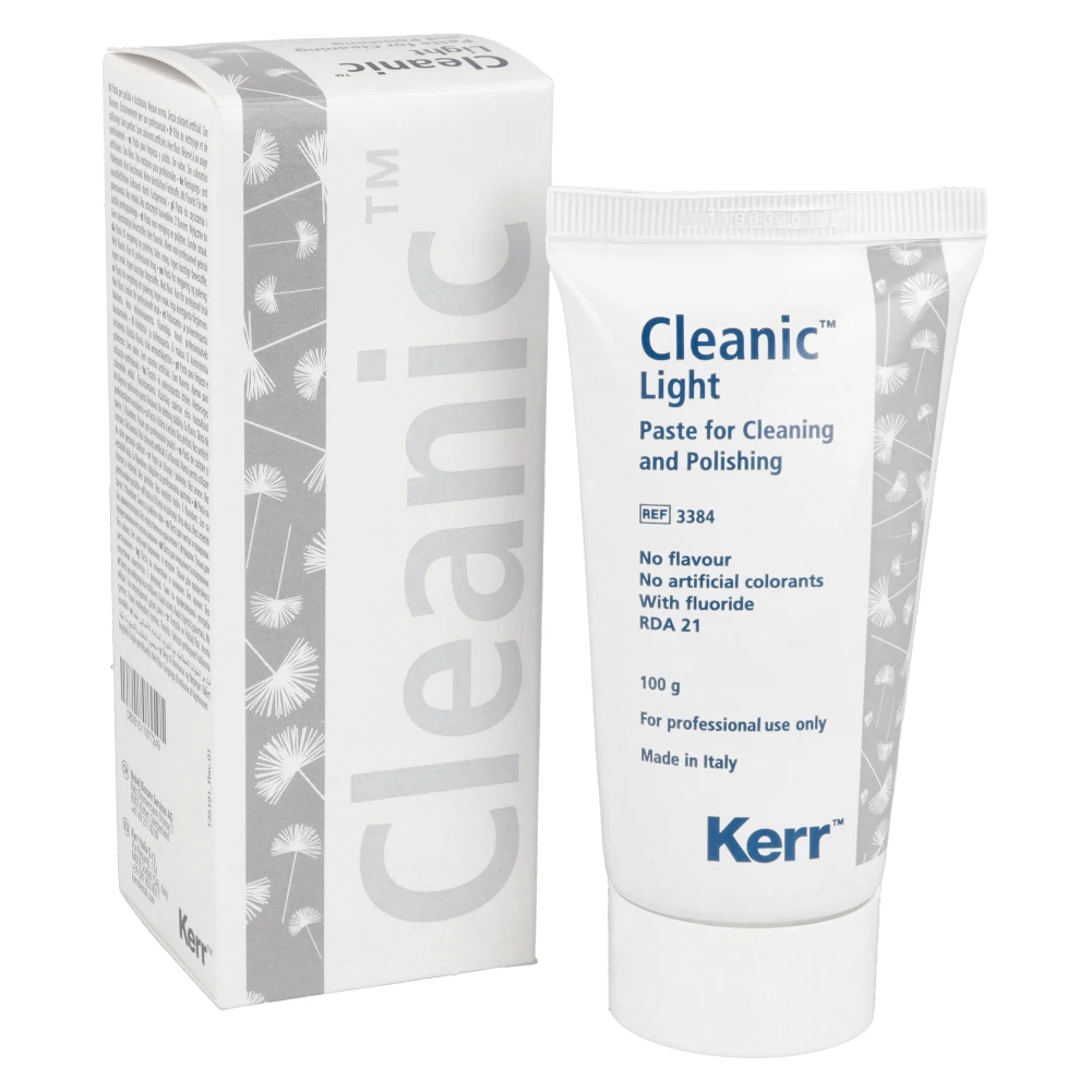 Cleanic Light to jednoetapowa pasta profilaktyczna przeznaczona do profesjonalnego czyszczenia i polerowania powierzchni zębów. Produkt łączy usuwanie osadów i biofilmu oraz polerowanie szkliwa i wypełnień w jednym kroku, co przyspiesza i upraszcza zabieg profilaktyczny. Cleanic wykorzystuje naturalne cząstki perlitu o zmiennej abrazyjności, które w trakcie pracy zmieniają strukturę od właściwości czyszczących do delikatnych efektów polerujących. Dzięki temu pasta zapewnia wysoką skuteczność oczyszczania i polerowania, jednocześnie pozostając łagodna dla szkliwa i zębiny.