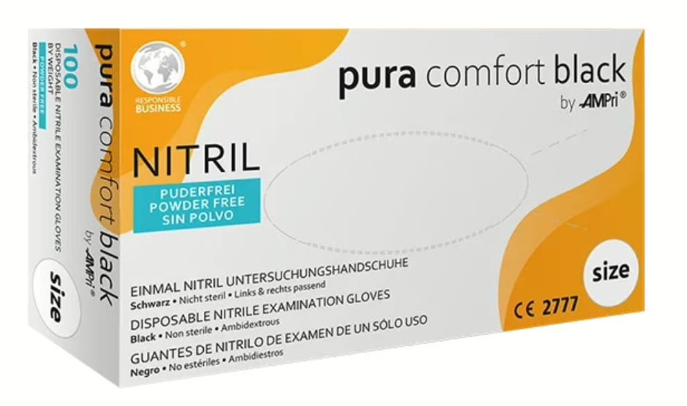 Rękawiczki nitrylowe Pura Comfort Black, to wysokiej jakości jednorazowe, bezpudrowe rękawice ochronne, wykonane z syntetycznego nitrylu. Brak pudru eliminuje ryzyko zanieczyszczenia powierzchni roboczych oraz ogranicza podrażnienia skóry, co czyni je idealnym wyborem do zastosowań medycznych i laboratoryjnych.