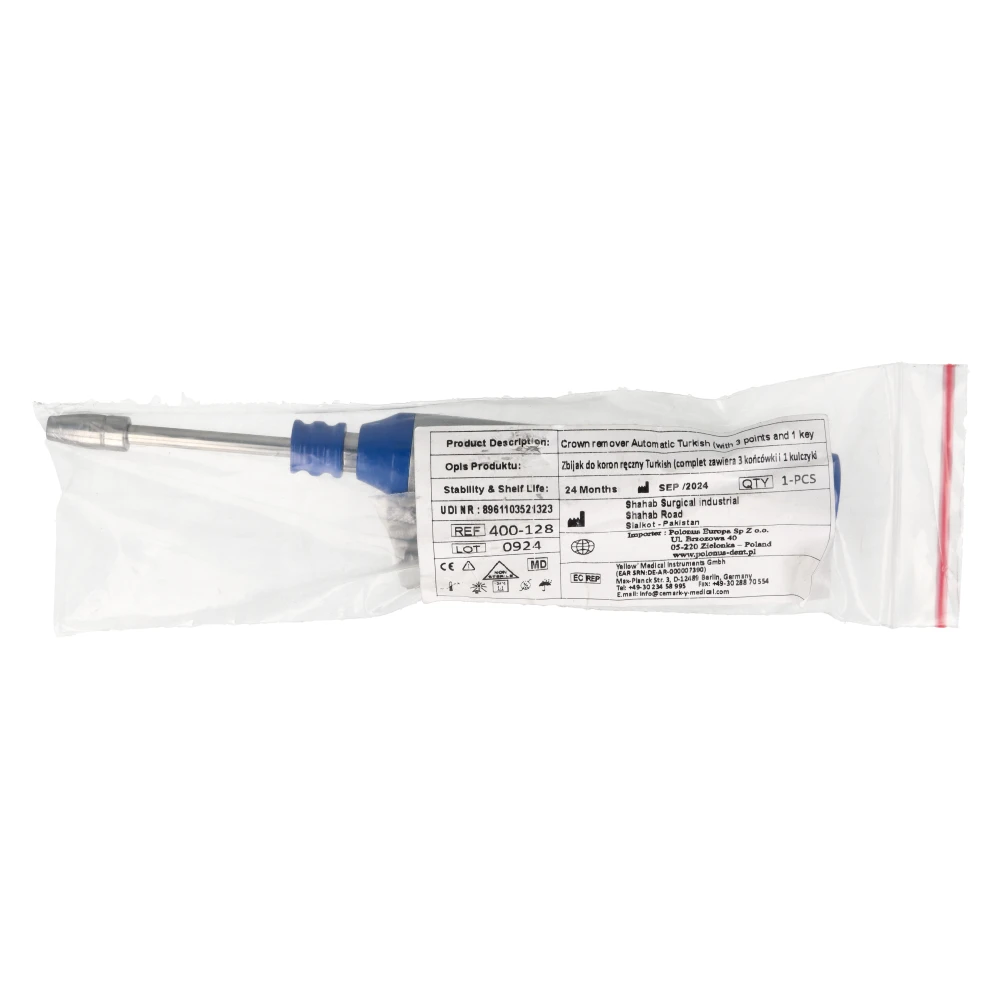 Automatyczny zbijak do koron typu Turkish marki Polonus to wysokiej klasy, precyzyjne narzędzie protetyczne zaprojektowane do sprawnego i bezpiecznego zdejmowania stałych uzupełnień protetycznych. Instrument działa w oparciu o mechanizm automatycznego wyzwalania impulsu, który skutecznie przerywa strukturę cementu mocującego koronę lub most do zęba filarowego.