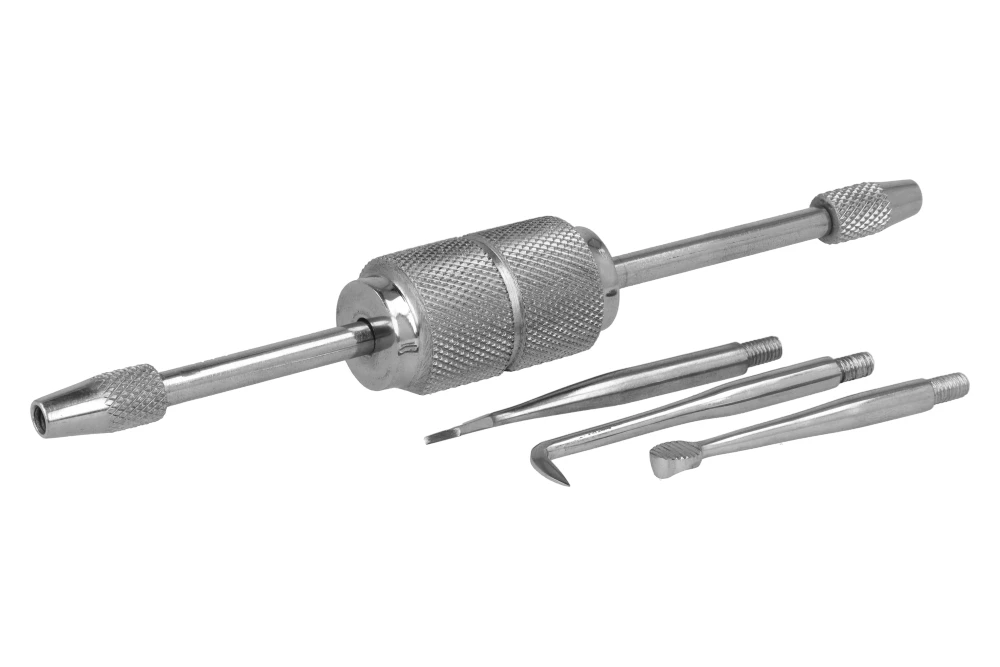- urządzenie posiada końcówki z obu stron rękojeści, co umożliwia pracę w dwóch kierunkach albo z obu stron korony/mostu. Zwiększa to uniwersalność narzędzia - użytkownik nie musi zmieniać narzędzia lub rękojeści, tylko obraca lub przełącza stronę w zależności od potrzeby.