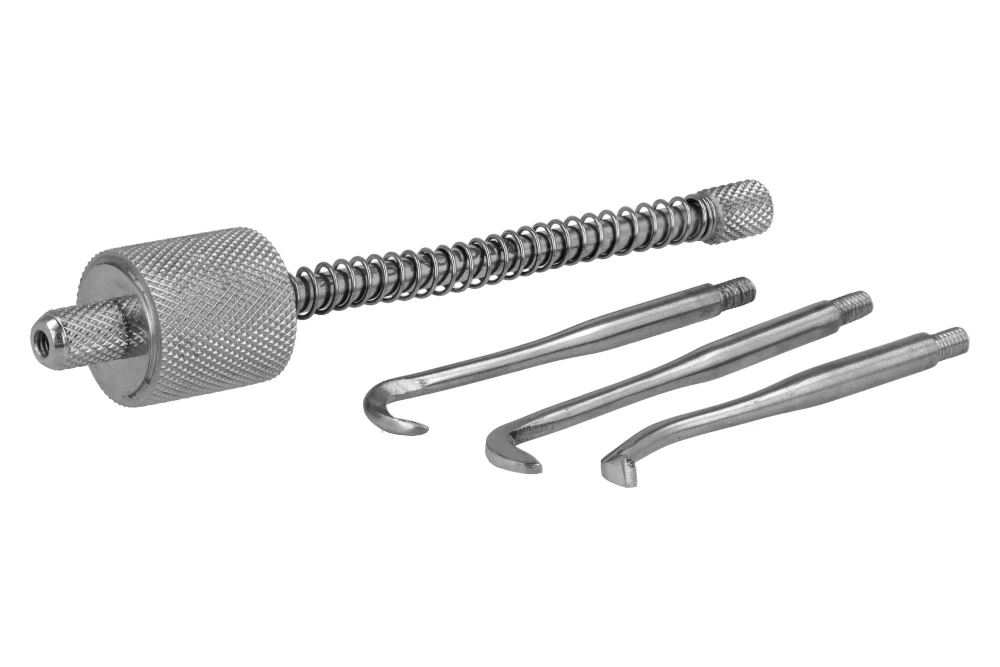 Narzędzie wyposażone jest w mechanizm sprężynowy umożliwiający generowanie kontrolowanych uderzeń, co pozwala na sprawne usunięcie uzupełnień protetycznych przy jednoczesnym ograniczeniu ryzyka uszkodzenia zęba filarowego oraz tkanek otaczających. Rozwiązanie to zwiększa komfort pracy lekarza oraz bezpieczeństwo pacjenta.