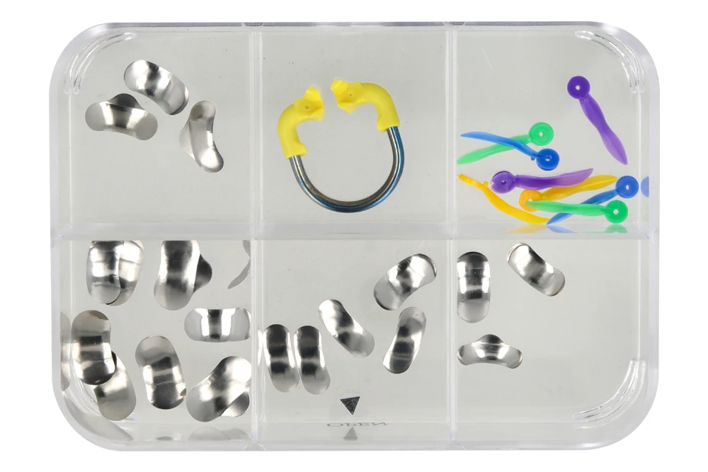 - zestaw zawiera kliny oraz pierścień zaciskowy, ułatwiający stabilne utrzymanie matryc sekcyjnych podczas aplikacji i modelowania materiału odtwórczego.