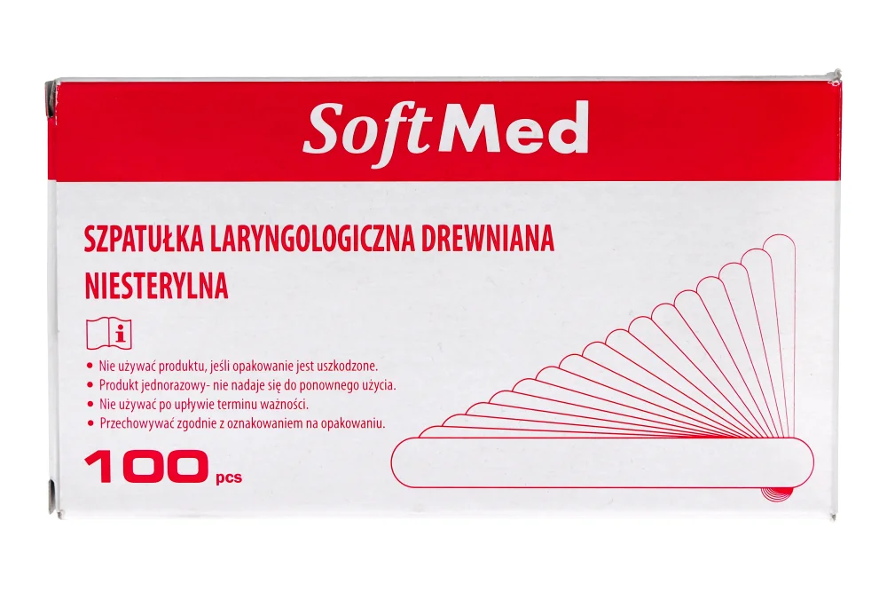 Opakowanie zawiera: Szpatułka laryngologiczna drewniana niesterylna 100 szt. SoftMed.